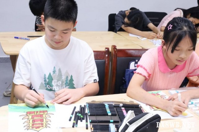 图为小朋友们沉浸式绘画黄鹤楼。湖北工业大学 李汉星摄