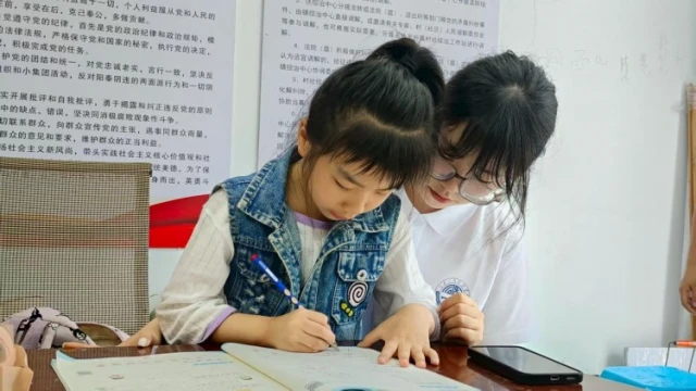 (图为实践队辅导小朋友完成作业)