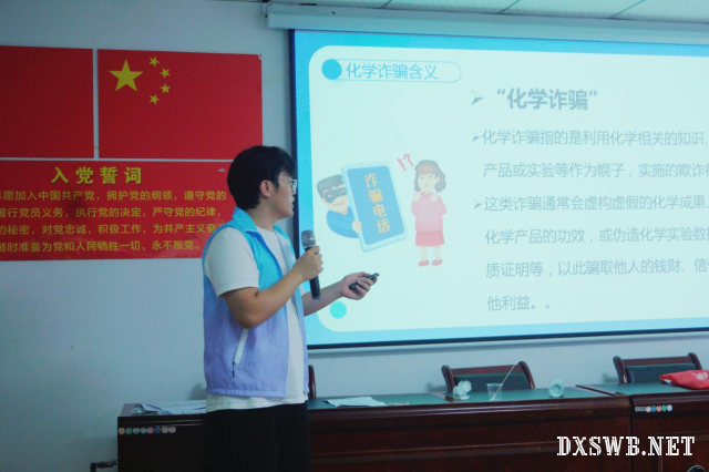 “化学诈骗就像一场虚假的化学反应,骗子用花哨的术语当‘催化剂’,让大家的钱袋子不知不觉‘反应’没了。”实践团成员用生动类比,揭开了这类骗局的本质——它们往往披着“纳米技术”“新型材料”的外衣,靠公众不熟悉的化学符号、实验数据唬人,要么虚构“包治百病的化学保健品”,要么伪造“能暴富的化学成果转让”,最终骗取钱财。