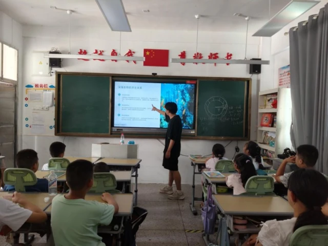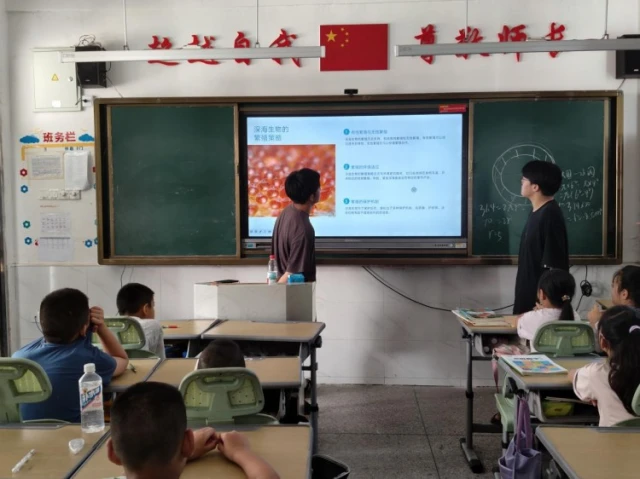 2025年7月15日,蒲团乡横山中心小学的暑期课堂化身神秘“深海探秘舱”。朝夕守望志愿服务队的志愿者老师,以BBC《地球脉动》震撼的深海片段为钥匙,为孩子们开启了一场关于生命韧性与海洋奥秘的奇幻旅程。
