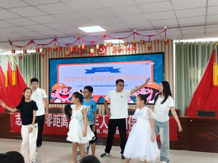 图为实践团成员带领孩子们表演的反诈话剧“钱袋保卫战” 图源:杨咪咪
