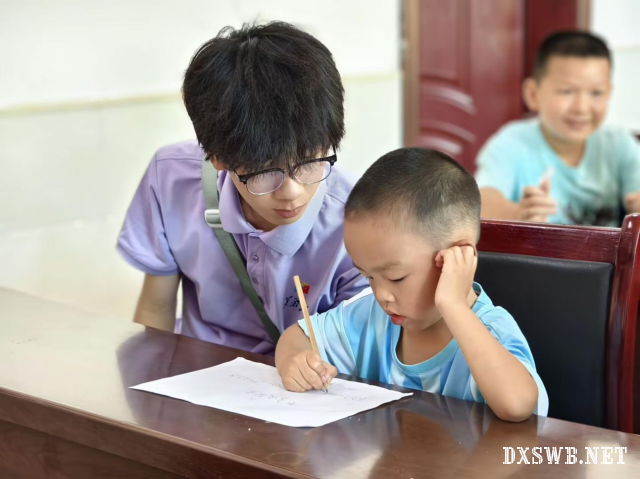图为志愿者兰钟晨给小朋友辅导作业。吕霏霏 供图