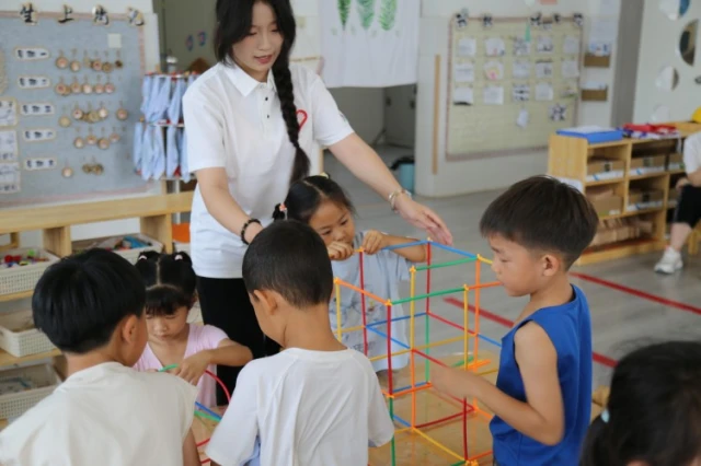 手工课上,幼儿们展现出了浓厚的参与热情与动手能力。活动以彩色吸管为主要材料,各小组幼儿在协作中完成了手工作品的创作。部分小组制作了带尖顶的“城堡”造型,另有小组完成了带阳台的“别墅”模型,还有幼儿运用彩纸对作品进行装饰,设计出带有“微笑”图案的门窗。活动过程中,幼儿们积极沟通、互相配合,通过传递材料、共同商议等方式推进创作,不时向教师展示成果,课堂氛围活跃,充分体现了幼儿的创造力与团队协作意识。