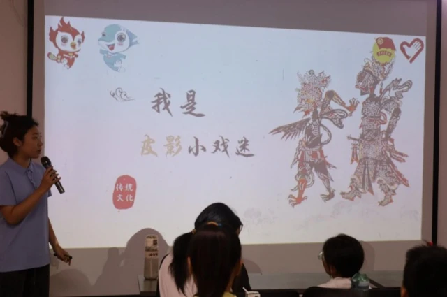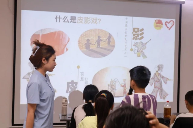 图为志愿者在课堂上为小朋友讲解皮影戏的相关知识。湖北工业大学 李汉星摄