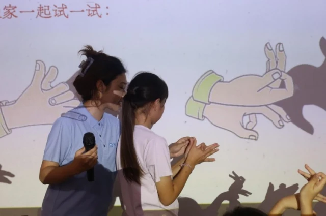 图为志愿者在帮助小朋友完成影子游戏。湖北工业大学 李汉星摄