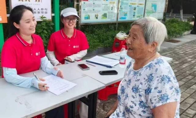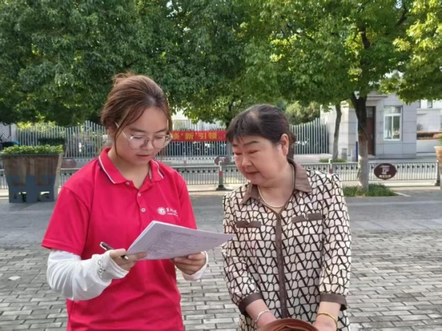 图为实践团成员向三河古镇居民讲解生态环境保护法实施情况调查问卷。姚玉娴 供图