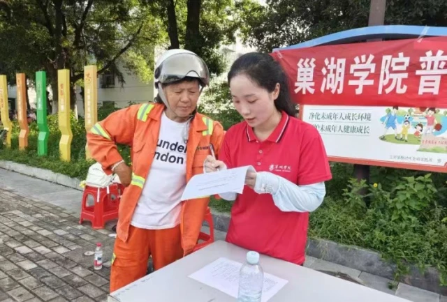 图为实践团成员协助环卫工人填写生态环境保护法实施情况调查问卷。刘雪玲 供图