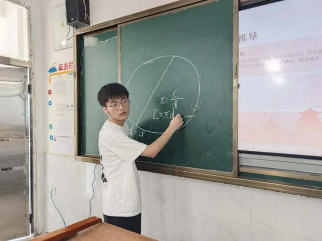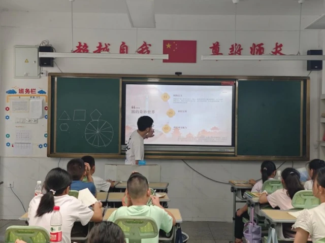 高年级课堂上,志愿者柳佳浩老师借助画图工具和实物演示,为学生们打开了“圆”的奇妙世界。他不仅讲解了圆的广泛应用,更利用希沃白板的动态功能进行了直观演示:拖动圆心点,圆的位置随之移动;调整半径长度,圆的大小实时变化——生动印证了“圆心定位置,半径定大小”的核心原理。学生们豁然开朗,纷纷跃跃欲试。