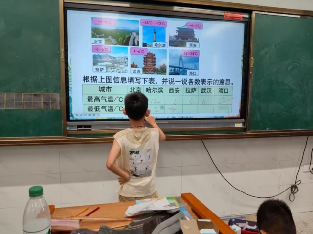 低年级课堂在“数字炸弹”游戏的欢声笑语中开启。志愿者闫雨欣老师引导孩子们依次报数,接近预设“炸弹”时的紧张与兴奋瞬间点燃课堂气氛。在孩子们情绪高涨之际,闫老师巧妙引入生活实例——冬天的零下气温、电梯的地下楼层,将“负数”这一抽象概念具象化。“零下5度怎么写?”“地下15层怎么表示?”一个个贴近生活的问题引发了孩子们的热烈讨论和积极思考。课程结束时,孩子们仍意犹未尽:“原来负数就在我们身边!”“还想再玩一次数字炸弹!”闫老师表示,希望通过这种轻松活泼的方式,让孩子们感受数学乐趣,点燃学习兴趣和探索热情。