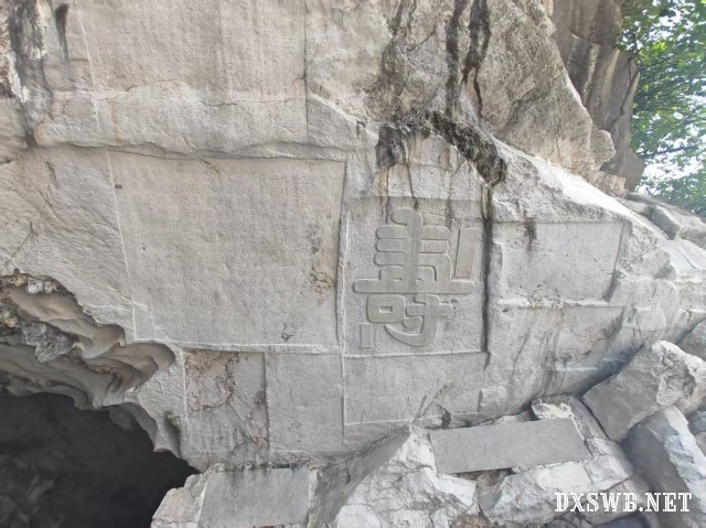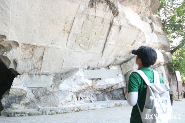 离开古城后,实践团队来到了与之一河之隔的百寿岩。百寿岩内的石壁上,现存有宋以来的石刻二十余处,其中最为著名的当属 “百寿图”。“百寿图”刻于1229年,由知县史渭下令刻写。一个巨大的“寿”字长175厘米,宽148厘米,其中巧妙地包含了101个小“寿”字,一字一体,无一雷同,是我国现今所见时代最早的集古代单字诸体于一身的摩崖石刻