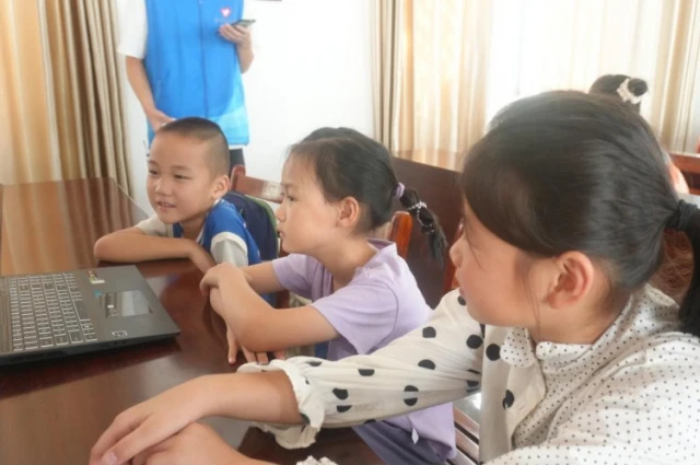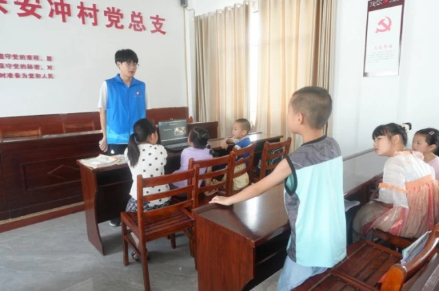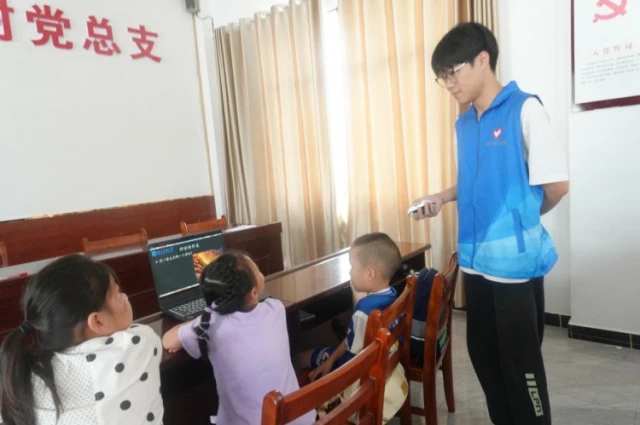 图为湖北工业大学志愿者给小朋友播放课件。湖北工业大学 杨思颖摄