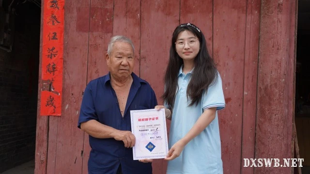 访谈尾声,一场庄严的仪式在斑驳木门前展开。实践团成员鹿雅洁将特制证书郑重递上任师傅掌心——封面镌刻“洛灯汉韵,文脉传薪纹样设计”,纹样融合了河南博物院藏三彩宝相花纹盘和徐州博物馆藏铜铺首的线条,体现了徐州和河南文化的融合。并说道:“您六十年的坚守,照亮了我们来时的路。”,“好!特别好!”他摩挲着纹样,仿佛触到文化的未来。