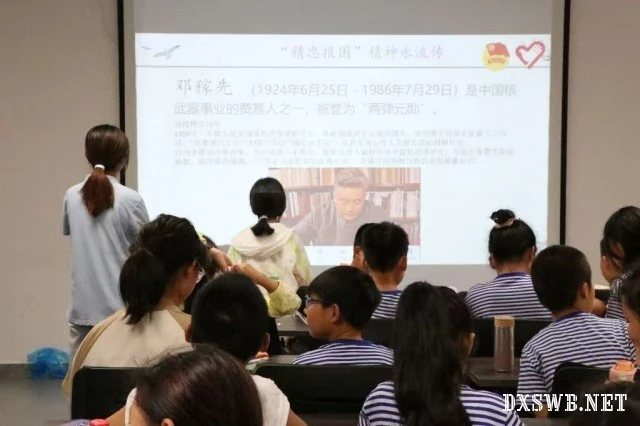 图为志愿者为小朋友们介绍现代爱国人物邓稼先先生。湖北工业大学 朱逸涵摄