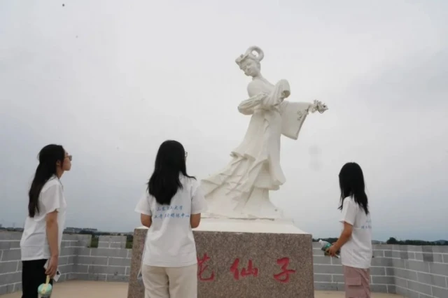 实践团成员欣赏梨花仙子雕像。 吴瑶瑶 供图