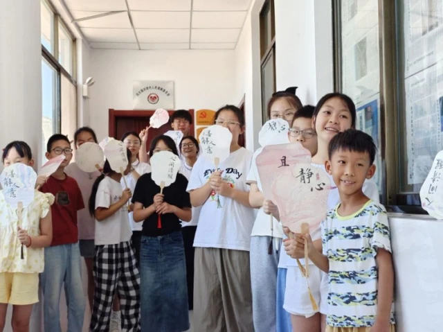 之后的漆扇制作同样精彩纷呈。实践团成员先介绍漆扇的千年工艺传承,随后指导实操:孩子们仔细擦拭竹扇表面,刷清水让竹纤维舒展;待扇面晾干,按比例调配漆料,用调色刀顺时针搅拌至均匀无泡;再以细毛笔蘸漆,沿扇骨方向均匀涂抹,有的选靛蓝,有的用朱红,还有的尝试渐变效果;第一层漆半干后,用细砂纸轻磨至光滑,再涂第二层增强质感;最后在干透的扇面上绘制五角星、花草等图案,一柄柄兼具创意与古韵的漆扇渐次成型,传统文化韵味在指尖流淌。