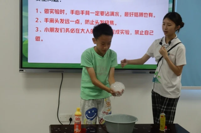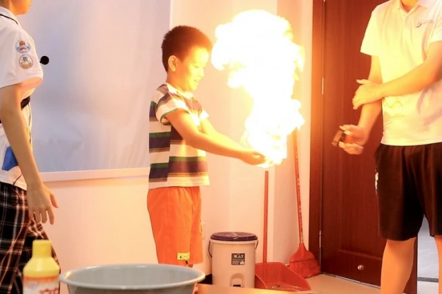 孩子们以此在老师的贴身指导下,严格按照规程操作。在点火前,孩子们屏住呼吸,小脸紧绷,眼神紧紧盯着自己覆盖着泡沫的手掌,交织着难以抑制的紧张、对未知结果的忐忑以及对见证奇迹的强烈渴望。助教老师协助孩子点燃火焰,一团橙黄色的火焰瞬间在孩子的手掌上方腾跃而起!火焰跃动的刹那,孩子们的眼睛猛地睁大,不由自主地发出短促的惊呼。短短一两秒后,火焰迅速熄灭,只留下些许温热感和完好的手掌。