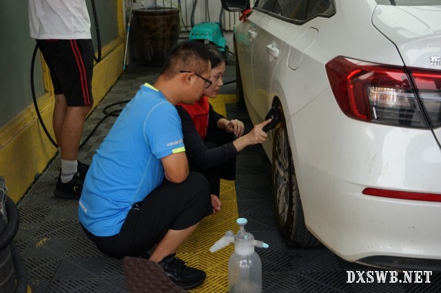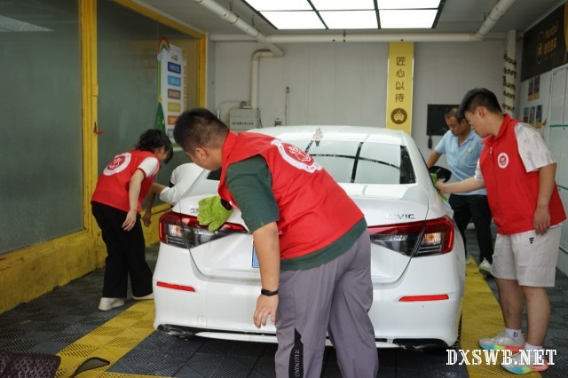 在“憨兜家园”洗车员的耐心指导下,实践团成员先近距离观摩学习,再迅速投入实践:洒水浸润车身、均匀喷施泡沫、细致擦拭轮毂、深度清洁内饰、精准操作吸尘、全面抛光擦干……每一个环节都在专业示范中有序推进。