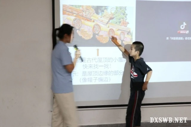 图为小朋友寻找古代屋顶上的四大神兽瓦当,开展知识考察互动。湖北工业大学 朱逸涵摄