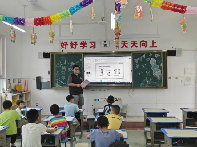 (图为队员陈子阳带领孩子们进行课堂互动)