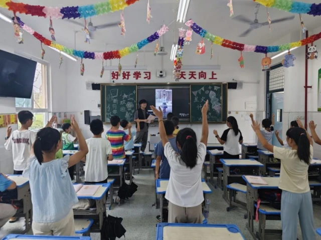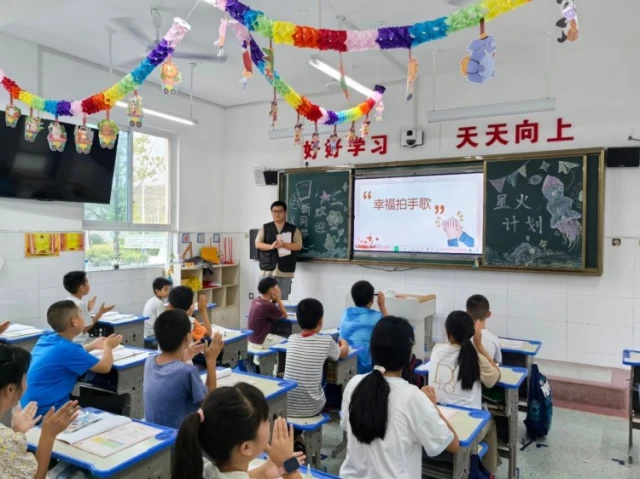 最后的“幸福拍手歌”的互动游戏与集体齐跳《你笑起来真好看》,则将现场气氛推向了高潮,实践队队员王者带领孩子们通过轻快的节奏、舒展的动作,让他们在肢体表达中释放快乐,将幸福感转化为生动的体验,孩子们的积极参与也让整个教室都充满了欢声笑语。