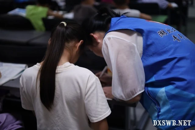 图为志愿者辅导小孩子写作业。湖北工业大学 李汉星摄。