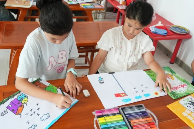 绘画环节中,“红领巾小课堂”的同学们手执画笔,纷纷画出自己眼中的世界。有的孩子一笔一画认真描绘“天安门”,稚拙的笔触里藏着最单纯的爱国情怀;有的孩子用画笔勾勒自己的家,画纸上小小的房子和家人,是孩子们单纯世界中最美好的地方;还有的孩子发挥天马行空的想象,描绘了自己眼中美好奇幻的世界。绘画给了孩子们一份表达自我的机会,在轮廓的勾勒与色彩的涂抹中,同学们的想象力与好奇心也得到了提升。