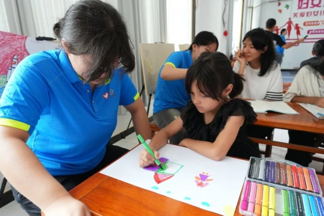 图为实践团成员与学生一同绘画