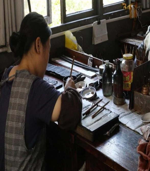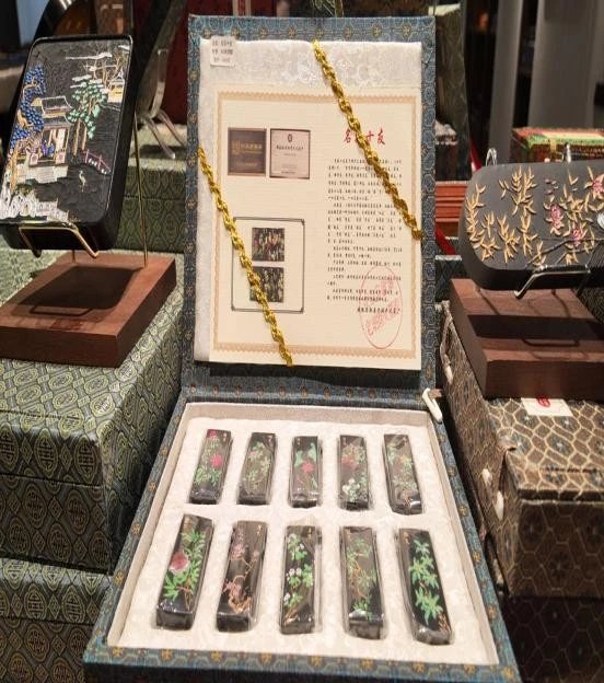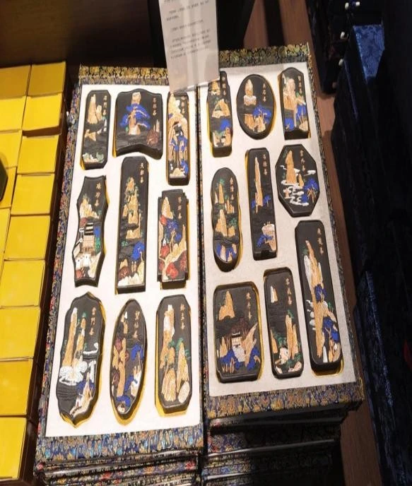 徽墨的制作工序,是一场对传统技艺极致追求的演绎。基础原料的选择极为讲究,松烟选取黄山、九华山一带的优质松木,在特定的窑中以独特火候燃烧,让松木不完全燃烧,生成细腻、纯净的烟料,这是决定墨色纯正、质地优良的关键;桐油则要求产地与提炼工艺严格把控,以确保其油性稳定,燃烧后烟质均匀。辅料中的麝香、冰片、金箔等,每一种都有独特作用,麝香赋予墨料天然香气,冰片提升墨色层次感,金箔增添墨锭的华贵质感。制烟时,匠人凭借代代相传的经验,精准掌控火候与时长,确保烟料品质;和胶环节,依据四季气候与环境湿度,灵活调整胶与烟料的配比,让墨料在后续制作与长期保存中质地稳定,不易变形、干裂。从捶打成型时千余次的捶击,赋予墨锭紧实结构,到晾墨过程中数月乃至数年在通风阴凉处的静置,让水分自然挥发;从手工锉边、洗水让墨锭外形规整、表面洁净,再到描金工艺以细腻笔触勾勒出精美图案,每一道工序都是手工技艺的传承,让徽墨“拈来轻、磨来清、嗅来馨、坚如玉、研无声、一点如漆、万载存真”的品质得以延续。