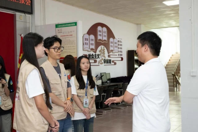 图为育青知行实践团成员与黄嘉豪副主任交流心得。供图 徐力