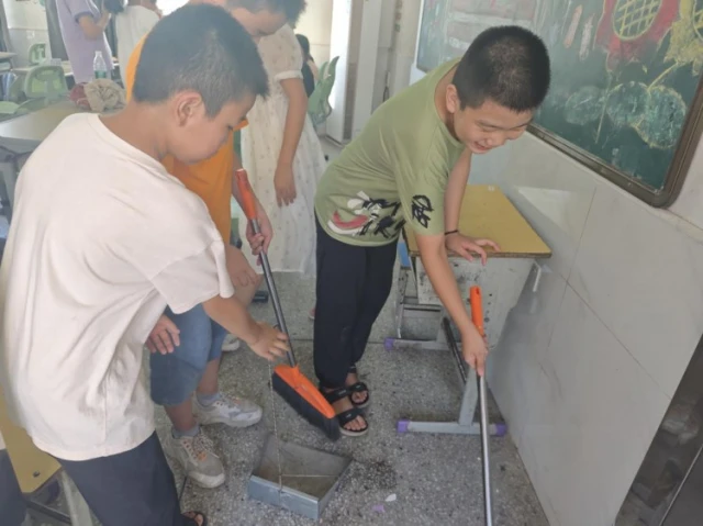 离别的时刻没有感伤,校园里跃动着忙碌的身影。志愿者们与孩子们分工协作,默契十足:高年级学生和志愿者奋力清扫操场落叶,低年级小朋友则仔细擦拭教室门窗桌椅,。竹扫帚划过地面的沙沙声,孩子们发现角落垃圾的呼唤声,志愿者指导清洁技巧的叮嘱声,汇成了结营日最生动的乐章。阳光照耀下,汗水浸润的脸庞闪烁着真诚的光芒,洁净的校园成为这段夏日情谊最明亮的见证。