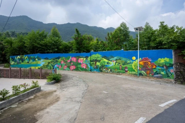 10余名成员分工协作,历经14天精心绘制:从测量墙面、勾勒轮廓到调配颜料、精细上色,每一笔都紧扣“景墙相融”理念——墙面与周边的栈道石板、古屋灰瓦形成视觉呼应,使墙绘既成为独立艺术作品,又自然融入乡村景观肌理。“希望让游客刚踏入村口,就能通过这幅画感知兰龙的自然与人文之美。”实践团成员表示。