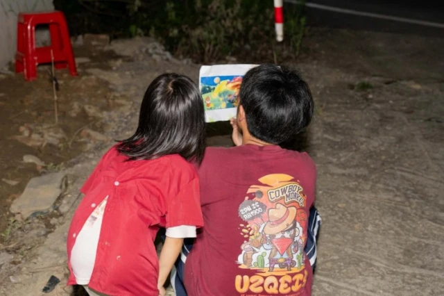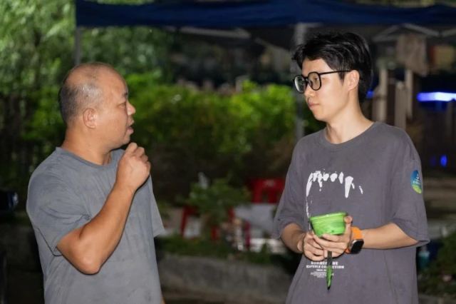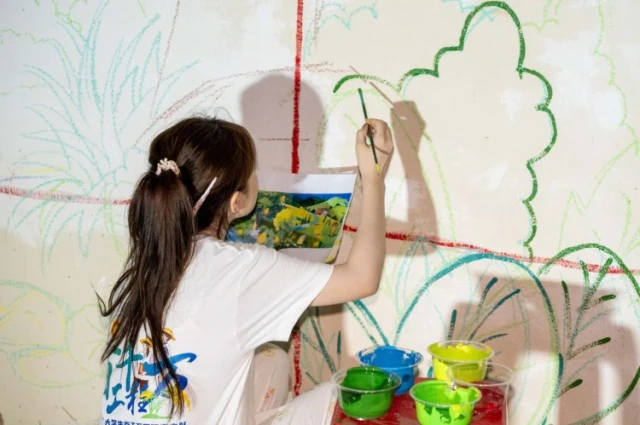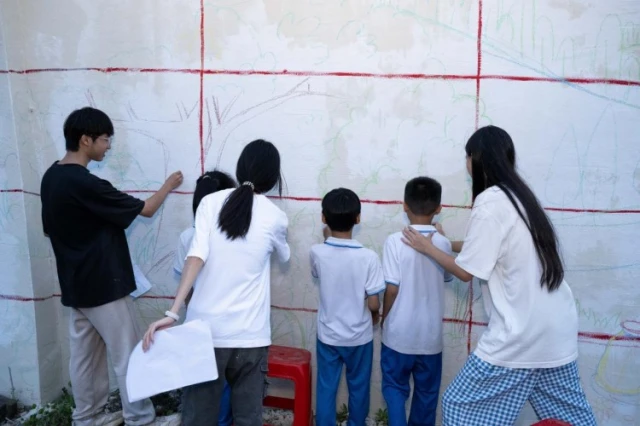 墙绘创作现场吸引了村内孩童的浓厚兴趣。他们自发聚集于墙根,或专注凝视初具雏形的草木轮廓,或好奇轻触未干的颜料。实践团成员主动邀请小朋友参与创作,孩童们沉浸于艺术氛围中,欢声笑语融入夏夜。期间,一位村民向实践团指导老师谭天宇询问:“这画的是咱们山里的景色?画好后,能让村子变得更美、更有特色吗?”谭天宇回应:“墙绘设计灵感源自本地萤火虫基地特色,完成后将为村庄增添独特的文化风景线。”村民的质朴期许与孩童的纯真喜悦,更坚定了实践团的创作初心,实践团成员以更专注的笔触投入绘制,让每一抹色彩都承载着乡村对美的向往。