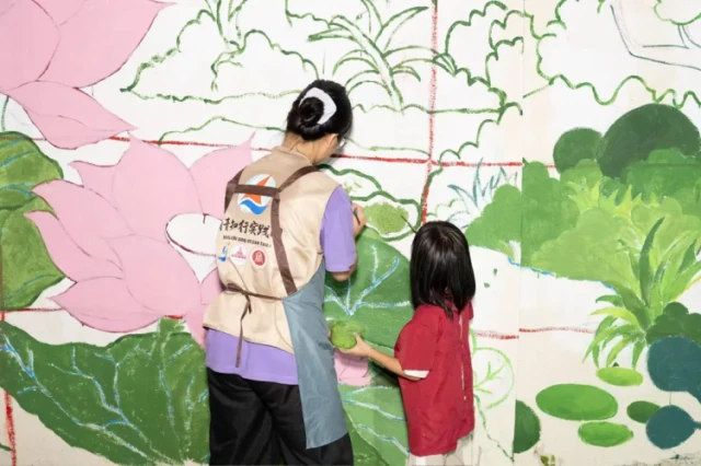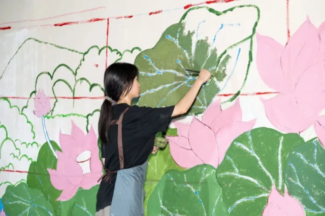 图为育青知行实践团成员绘制荷叶图案。供图 徐力