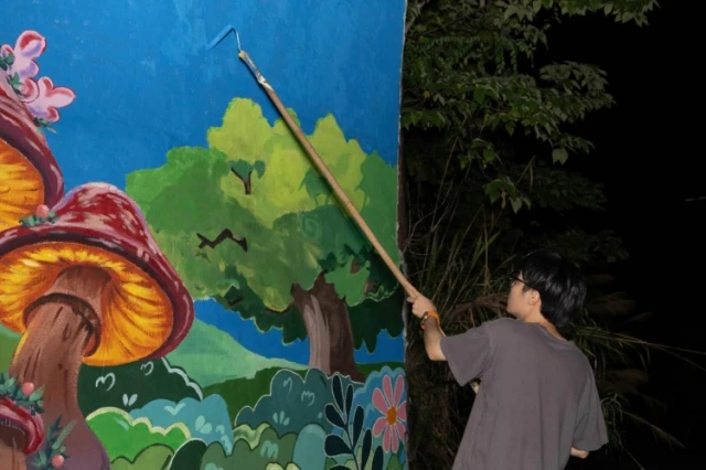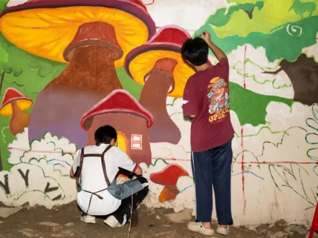 创作伊始,实践团先对黄白相间的素色墙面均匀涂刷白色底漆,为后续创作奠定平整基础。依据设计图稿,成员用粉笔在墙面精准勾勒溪流、蘑菇、草叶等自然元素轮廓。进入色彩创作阶段后,成员对颜料进行专业调配,精准模拟夏夜深邃蓝调、草叶鲜嫩绿意、蘑菇温润褐红等自然色调。绘制过程中,成员从淡蓝溪流落笔,渐次铺展至幽蓝背景、鲜绿植被与红褐色菌盖,使设计图稿中的山野夏夜意象逐步立体呈现。最终,在光影映衬下,墙面生动展现出溪流波光、蘑菇质感与草叶清露般的细节,成功将平面图稿转化为触手可及的立体艺术景观。