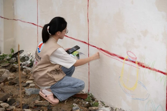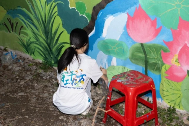 图为育青知行实践团指导老师谭天宇对墙绘局部色块进行补色修饰。供图 徐力