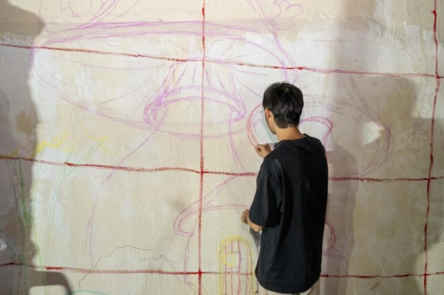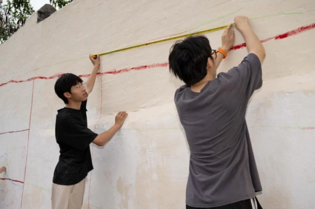 图为育青知行实践团成员在墙面上起型勾线。供图 谭天宇