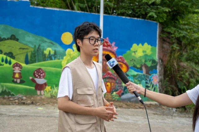 墙绘创作期间,团端州区委书记黄晓宇、睦岗街道办事处副主任黄嘉豪亲临现场视察指导,对实践团的艺术实践给予肯定。活动亦吸引媒体到场采访,实践团指导老师谭天宇在采访中系统阐述创作理念与实施过程——从结合当地民俗提炼核心视觉元素,到团队协作中的科学分工与动态优化,全面展现了此次“三下乡”社会实践的创作脉络,使实践团以艺术赋能乡村的实践印记,通过媒体传播获得了更具象的呈现与留存。