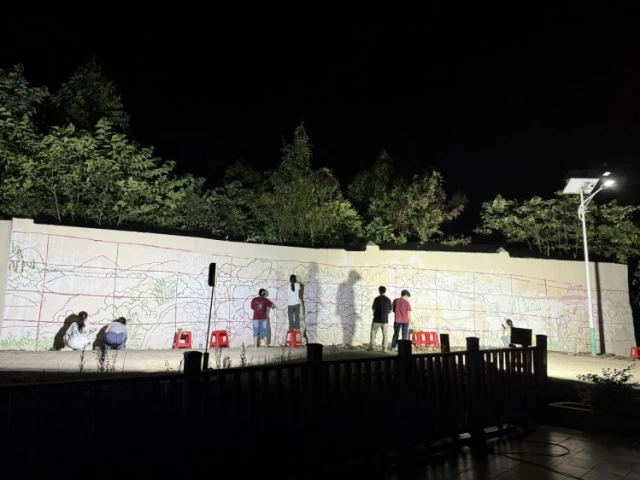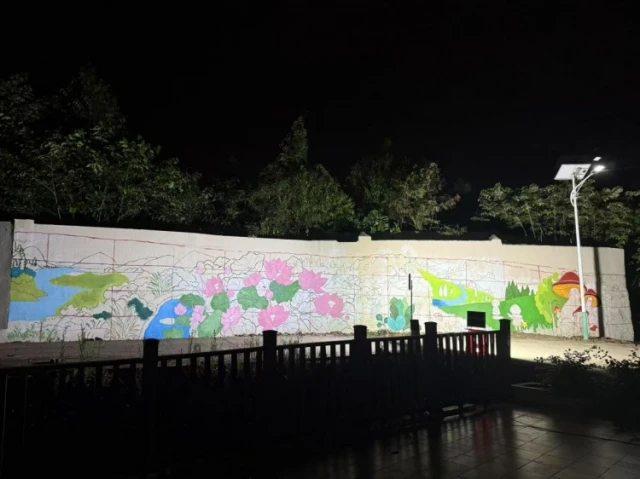 夜色中,实践团进入墙绘最终完善阶段。成员们专注于细节调整:对局部色块不均处进行补色修饰,柔化生硬线条轮廓,清除墙面多余颜料痕迹。虽未明确分工,但众人默契聚焦于画面衔接流畅度与色彩过渡和谐性等细节。随着最后一笔调整完成,整幅作品艺术表现力显著提升,呈现出和谐统一、生动鲜明的视觉效果。