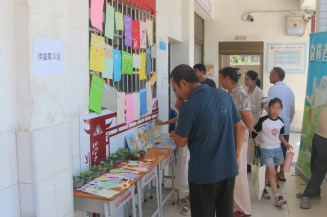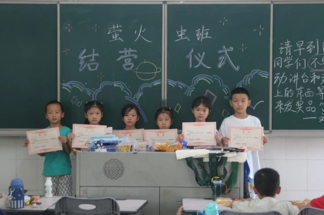 仪式前期,实践团成员提前完成教室内外的布置。实践团成员在教室内摆放奖品、布置黑板,在教室外的走廊上设四个专题展区。其中,推普展区陈列孩子们的推普成果手抄报,“两弹一星”展区展示孩子们在专题活动中的学习心得与绘画作品,非遗展区摆放孩子们参与非遗系列特色活动的手工作品,手工展区则汇集孩子们在各种手工活动中的实践成果,各类作品有序陈列,形成系统的成果展示区域。