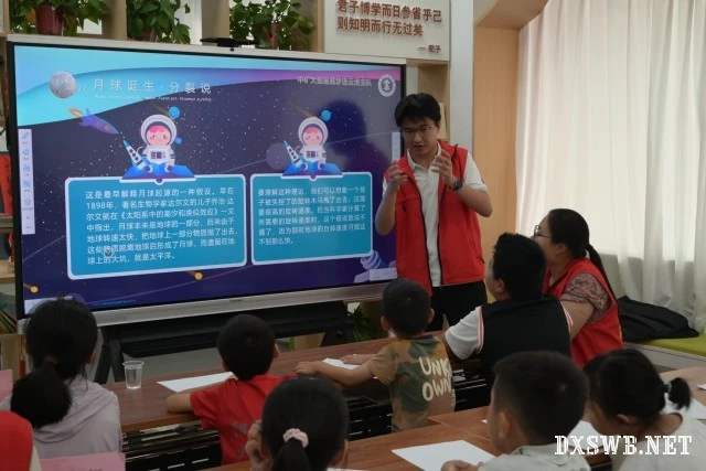 三点整时,活动正式开始。志愿者何政轩化身“宇宙向导”,用15分钟把月球的起源,月动力“压缩”成一张张图片。当屏幕上出现阿波罗计划留下的脚印至今仍在时,孩子们齐刷刷发出“哇——”的惊叹,仿佛同宇航员一起踏上月球。