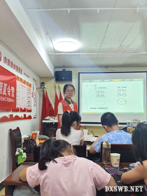 最受期待的环节莫过于亲手创作。在志愿者老师的指导下,孩子们结合课堂所学,先在脑海中构思自己心中的荷花景象。江甜老师耐心示范,一步步教授简笔荷花的绘画技巧。孩子们全神贯注,跟随节奏,挥动画笔,一幅幅充满童趣和个人理解的荷花画作跃然纸上。