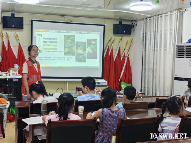 课堂伊始,志愿者江甜以宋代诗人杨万里的名句“接天莲叶无穷碧,映日荷花别样红”为引,描绘出六月荷花的盛景。随即话锋一转,抛出问题:“那么,秋季的荷花又是怎样的景象呢?”由此自然引出“残荷”主题——那是花瓣凋零、荷叶枯黄、形态渐残的秋日荷塘。