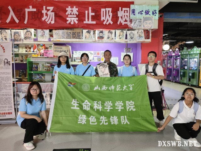 图为山西师范大学生命科学学院实践队队员与刘保在免费书屋合影