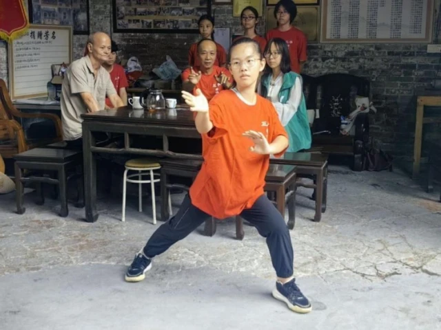 “徐师傅,您能给我们展示一下醒狮武术吗?”采访中,Young实践团与武馆教练徐新晃师傅及学员们围坐在一起,边做笔录边交谈。谈到醒狮技艺,徐新晃师傅立刻站起身来,边展示边讲解,讲到兴致处,特意亮了几招蔡李佛拳,其步法灵活稳健,刚中带柔。实践团成员们纷纷按下快门,记录这一精彩瞬间。