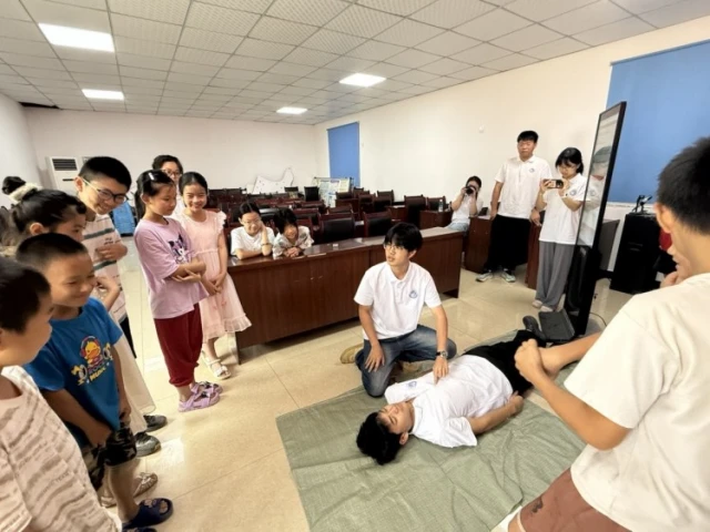 下午的课堂则转向关乎生命的实战演练。“会急救处置防暴雨、防溺水、防雷电及基础急救知识”实践课正式开讲。实践团成员首先用通俗易懂的语言,结合图文并茂的简易教具,系统讲解了遭遇暴雨、雷电时的避险要点,野外水域的危险性及防溺水“六不准”,重点强调了识别溺水迹象和呼救的正确方式。