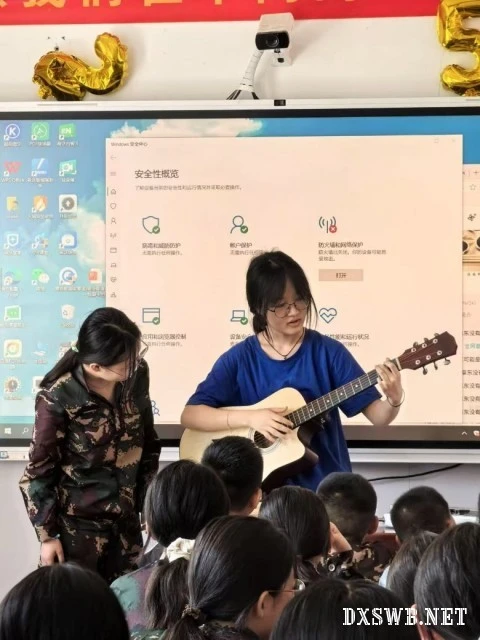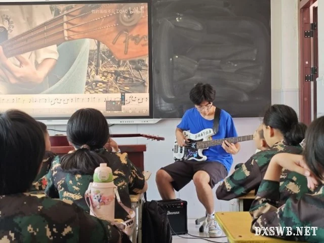 科普环节结束后,付睿楠进行了现场乐器演奏展示。吉他与贝斯先后登场,清亮的吉他旋律与低沉的贝斯共鸣交织,形成奇妙的音乐对话。当简单的和弦与熟悉的旋律流淌出来,原本喧闹的教室瞬间安静下来,孩子们的目光被乐器牢牢吸引,充满了好奇与喜爱。一些孩子情不自禁地跟着哼唱,更多的则专注地盯着老师的手指,试图看清音符是如何从琴弦上“诞生”的。表演结束,教室里响起了孩子们自发的、热烈的掌声,这份纯真的认可让实践队员们深受鼓舞。