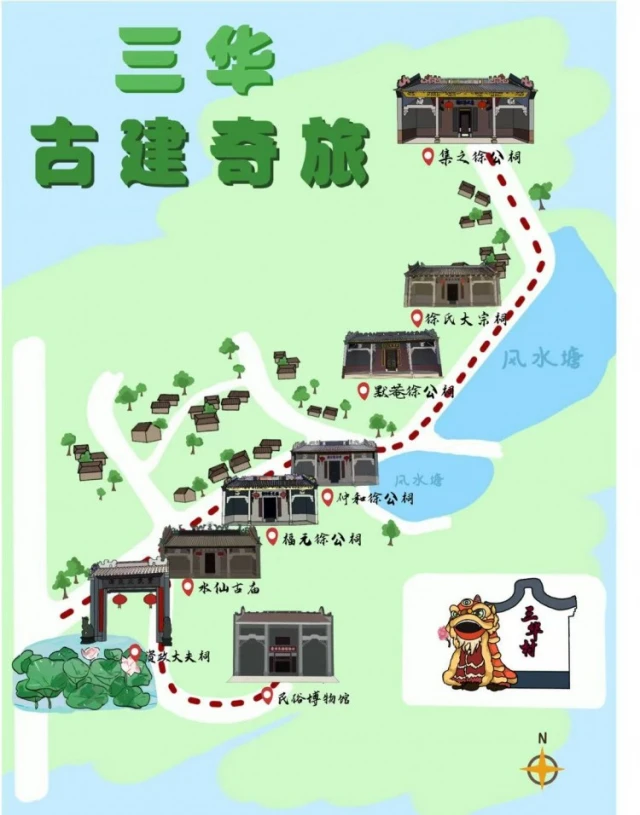 “三华村古建林立,祠堂众多,但是村中主干道的标志性建筑还是比较明显,我想以这个为出发点设计旅游打卡路线”,Young 实践团文创组组长陈佳怡同学主动承担起了这项手绘地图的任务。从“民俗博物馆-资政大夫祠-水仙古庙-福元徐公祠-仲和徐公祠-默庵徐公祠-徐氏大宗祠-集之徐公祠”这一空间路线的确定,到主题风格、色彩搭配等元素的选取,再到场馆外景、标志特征、文字标注等元素的绘制,陈佳怡同学结合亲身体验、学习思考和实践感悟,坚持原创性和真实性,最终为三华村绘制出了具有鲜明地域性、标志性和故事性的手绘地图。