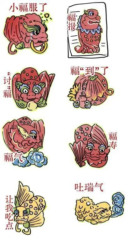 确定了将“小福”作为三华村的核心IP形象后,Young 实践团文创组的同学从灰塑作品中提取灵感,设计了“小福服了”“福报”“讨福”“福气”“福寿”“福到了”等众多衍生形象,整体采用圆润的线条和浓烈的色彩,塑造出可爱、呆萌且富有童趣的形象,传递惊喜、娇羞、兴奋、平和等多样情绪,并将IP形象广泛应用于扇子、手帐本、文化衫、包装袋、抱枕、手机壳、帆布袋等多种日常用品上。张颖同学谈到,“各具特色的的IP形象,可制作成贴纸、冰箱贴等,在社交聊天软件中可拉近人与人之间的距离,也可强化对三华村IP的情感联结;而文创产品则是实际功用和文化传播的双重载体,能让使用者在日常生活中随时随地感受到三华村的独特魅力,从而提升品牌影响力和美誉度。”