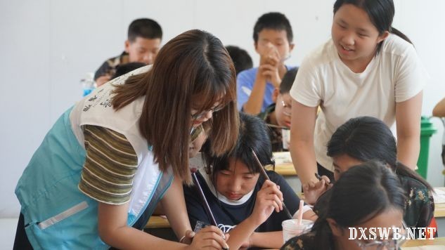 队员指导孩子们握笔并且演示中锋运笔(周泠佚摄)