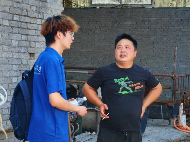 图为实践团队队长与养殖场场主进行交流对接 供图:周伊天随后,团队成员实地参观了养殖场的养殖区、饲料储存区及废弃物处理区,对养殖环境的通风条件、卫生状况,养殖设备的先进性及运行效率,为后续工作奠定了扎实基础。